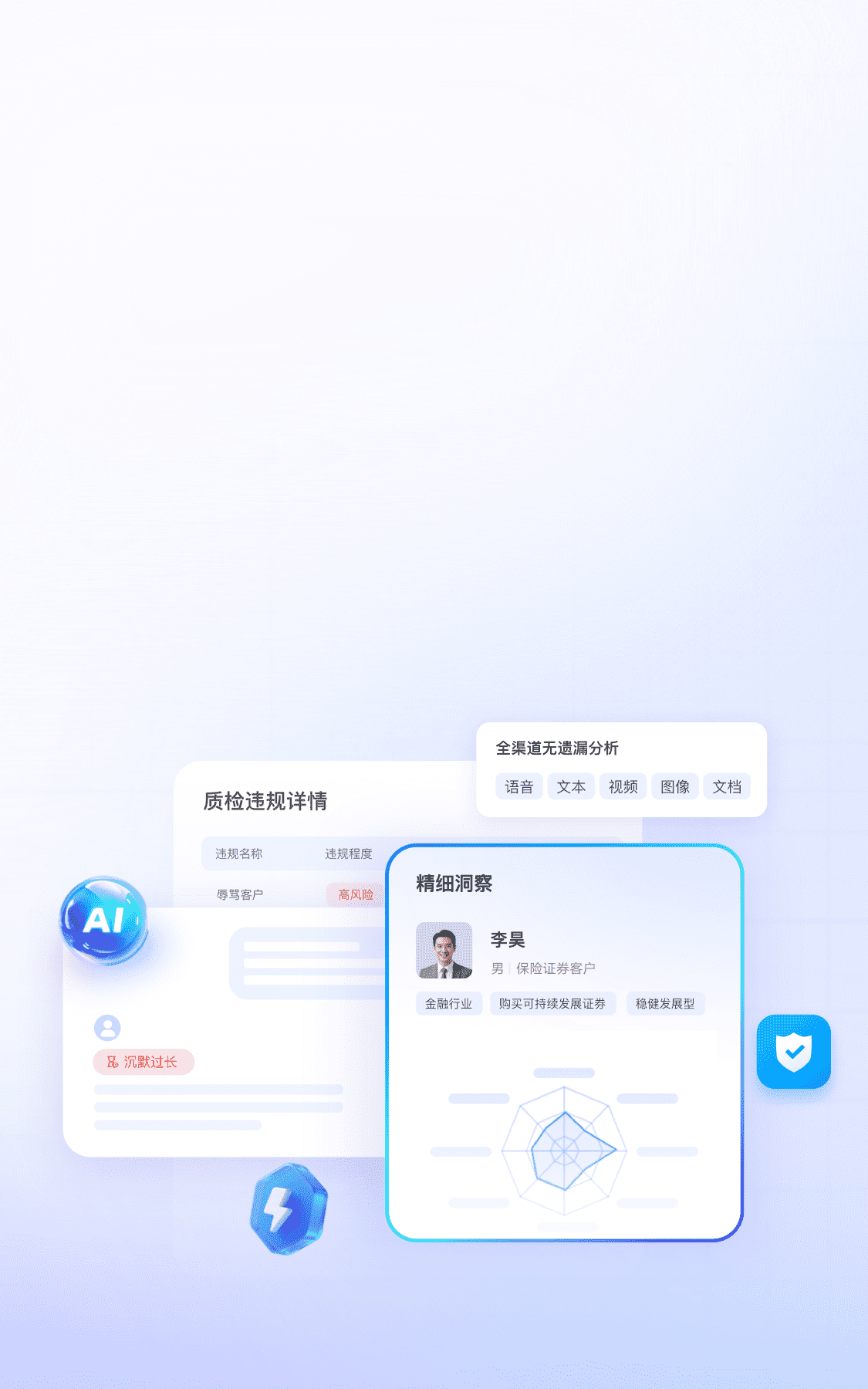 在复杂的客服与销售场景中,每一次交互都可能带来合规风险。基于自研大模型与成熟敏感词库,对文本、语音、视频、图像及文档进行全量分析,实现风险识别、分级告警与自动拦截,支持企业在快速扩张时依然保持高标准合规管理。