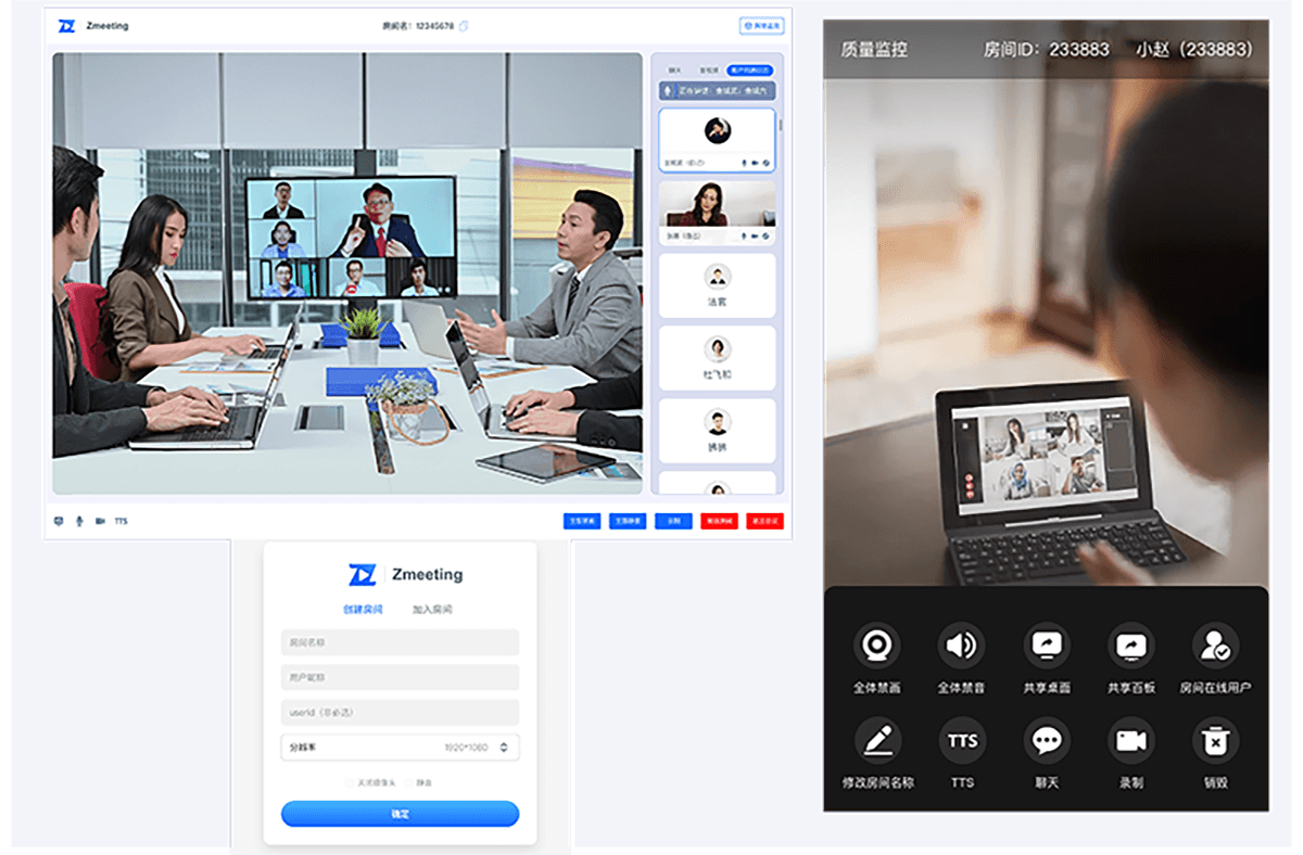 通过纯自研的ZRTC,致力于通过可集成、可定制的RTC技术为各类音视频应用提供高质、稳定、低延时的一对一、一对多、多对多的音视频通话能力