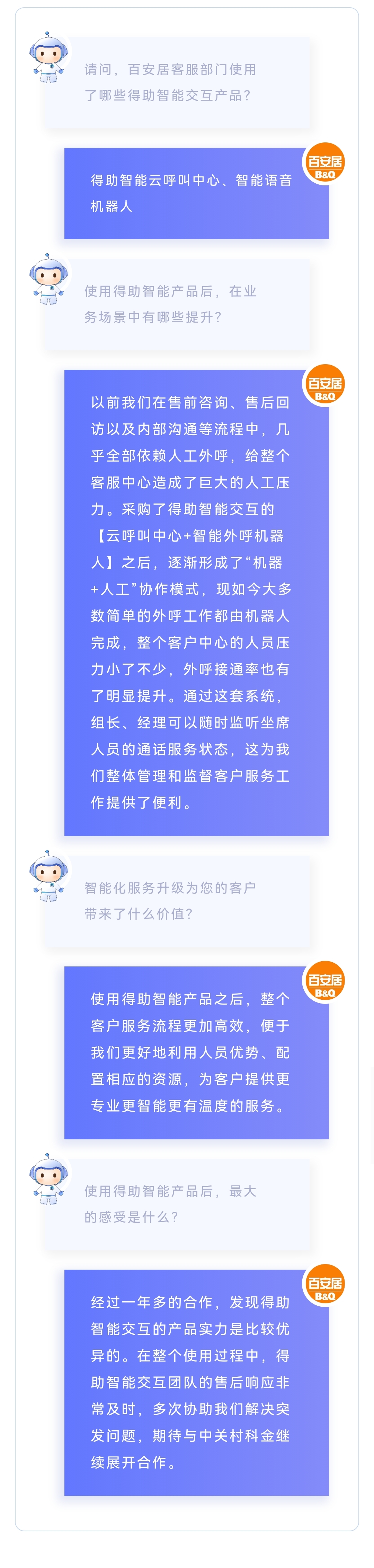在百安居的客户服务场景中,得助智能交互产品是如何助力百安居实现售前咨询、售中内部协作、售后回访的全链路智能服务升级的呢?