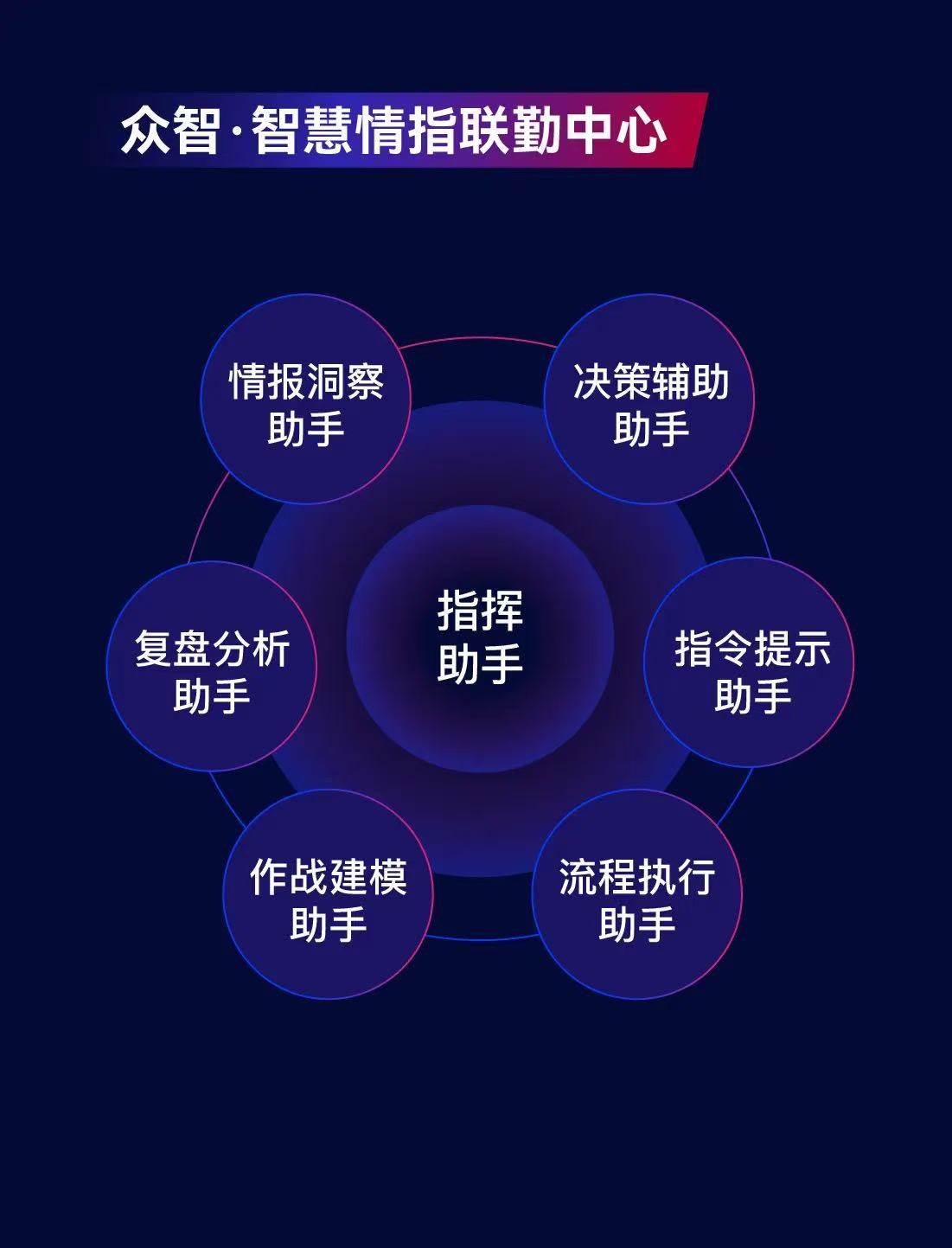 众智智慧情指联勤中心主要面向情报警情、决策指挥、合成作战以及勤务处置等场景。通过全流程 AI 辅助,打造了合成作战 "直通车"。以指挥助手为核心,整合了情报洞察助手、决策辅助助手、指令提示助手、流程执行助手、作战建模助手以及复盘分析助手等多个 AI 助手。通过跨部门协同增效和跨警种战术智能生成,借助多模态数据融合情报分析,使得处置时长大幅缩短,为警务工作提供了高效精准的决策支持。