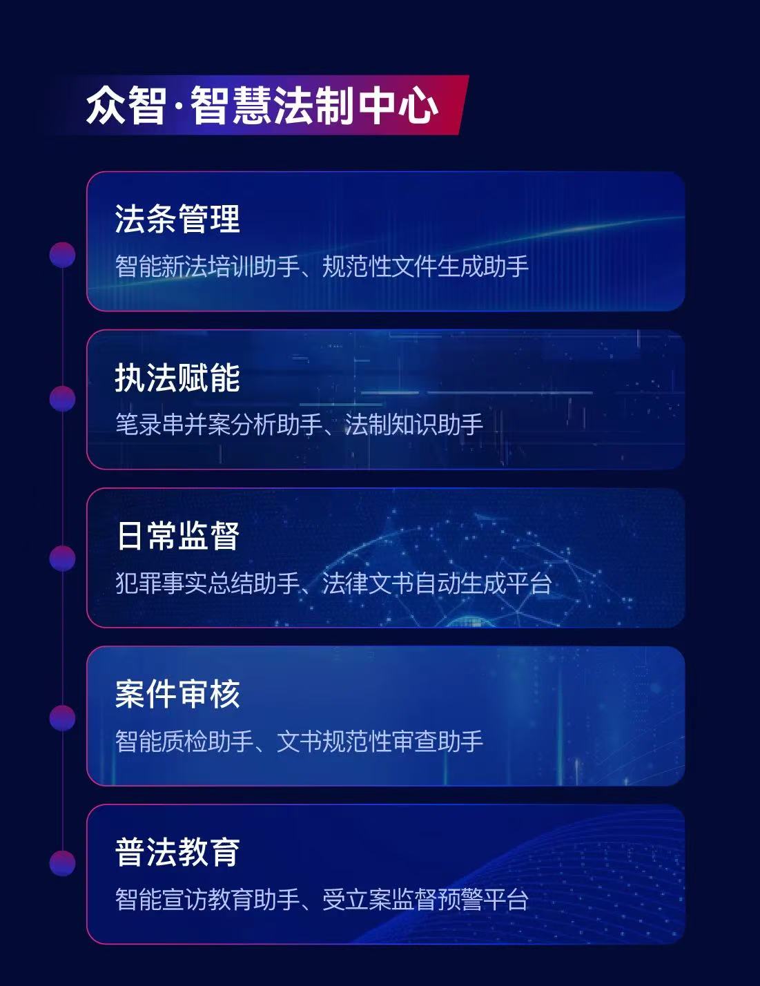 智慧法制中心主要针对法制工作中的法条管理、执法赋能、日常监督、案件审核、教育普法等场景,通过大模型技术实现全流程智能化处理,案件审核效率提升了87.5%,错误率降低了 65%。