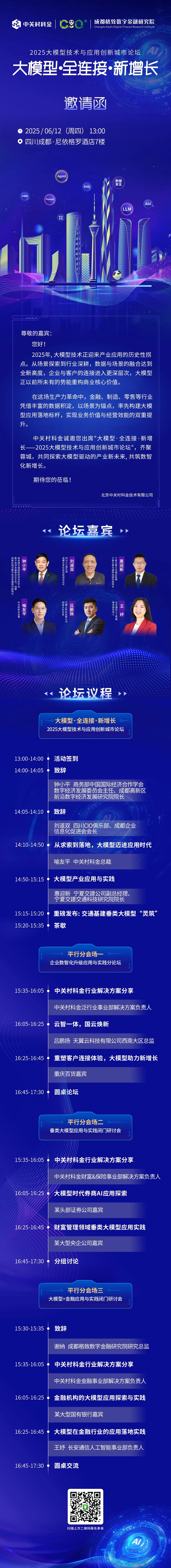 自2023年起,众闯信息科技战略布局大模型平台,积极推动垂类大模型在政务、金融、制造、工业等领域的应用落地。6月12日,公司将在成都举办“2025大模型技术与应用创新城市论坛”,一场主论坛 + 三场垂直分论坛,欢迎扫描下方邀请函二维码报名参加。