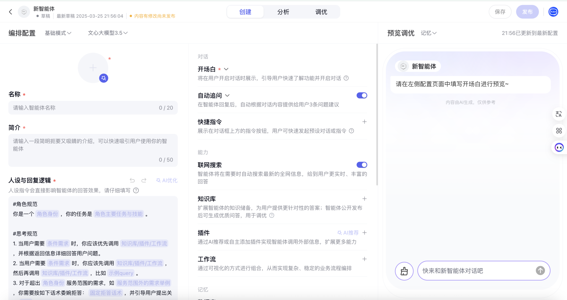 核心优势:依托文心大模型,在中文理解和生成能力上表现优秀;依托百度搜索和商家生态,智能体易于分发和实现商业转化,插件市场丰富;提供从零代码到低代码的完整创建方式,门槛较低,普及速度快。