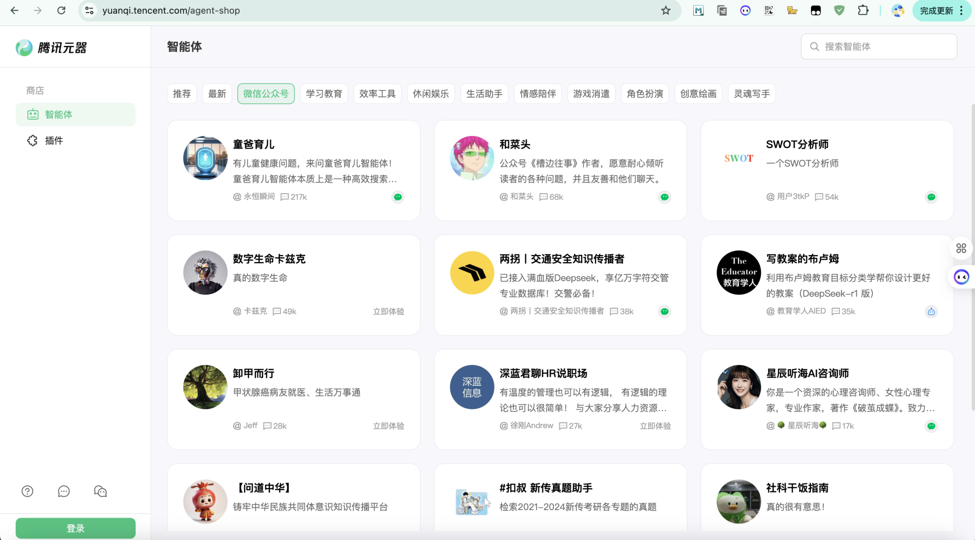 核心优势:与企业微信、公众号、小程序、腾讯文档等打通体验极佳,例如一键生成公众号问答机器人;交互设计流畅,用户体验好,适合构建面向员工或客户的轻量级应用;背靠腾讯混元大模型,平台功能和能力更新速度很快。