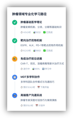 个性化培养体系构建专属成长路径。得助智能陪练系统可以基于一套自适应的学习机制,为不同学习背景、不同层级的医学销售代表设计专属的培养方案。例如针对肿瘤领域的医学代表,陪练系统可以提供从基础药理学到前沿免疫治疗的全方位知识模块,即从路径规划到内容推荐再到自适应调整的全方面个性化导师;针对基层市场代表,得助智能陪练系统也有一套自己的方法——强化医保政策和特定区域下的特色话术训练。比如在客户沟通模块,得助智能引入了心内科医生特点、其中涉及学术语言应用、循证对话技巧,帮助疑难问题的处理。这样一套自适应学习机制是从速度自适应到难度自适应再到方式自适应的全面发展。
