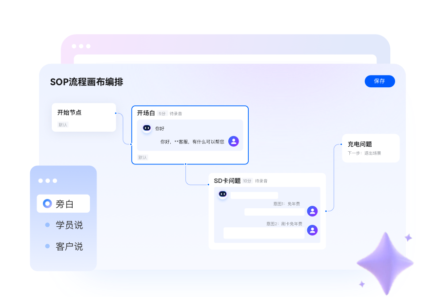 得助智能陪练内部嵌有大模型系统,支持智能剧本生成等功能。企业只需输入运用的业务场景关预期键词,系统就可以在3分钟内自动生成符合金融行业监管要求的标准话术剧本。比如在输入贷款产品介绍、逾期催收等专有名词时,系统就能够自动标注风险点,再生成符合规定的话术范例;同时系统也支持SOP画布陪练,也就是通过可视化的方式来帮助企业配置完整的话术流程,确保每个关键节点都可以有明确的合规指引。