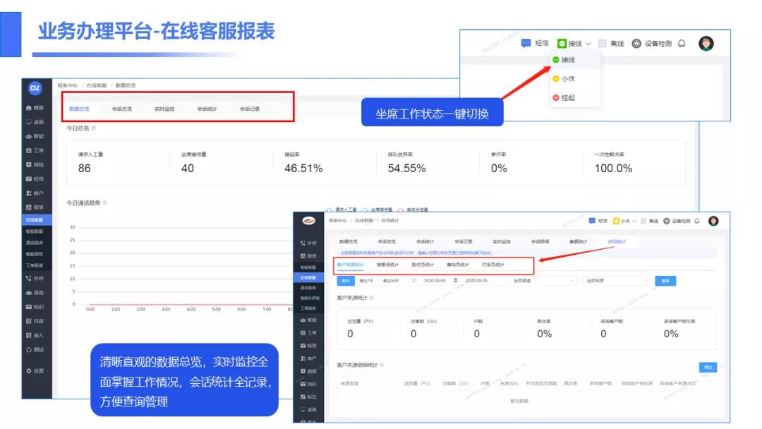 功能包含:客户端、在线客服工作台、报表中心、质检、工单、CRM服务平台