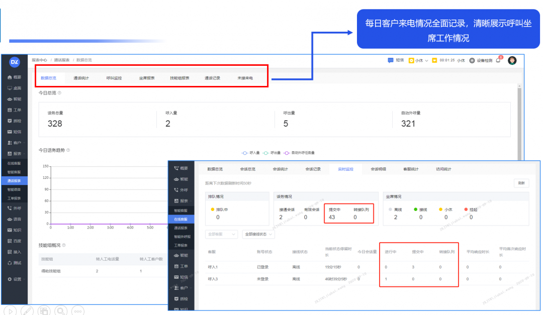 功能包含:坐席通话工作台、呼叫设置、外呼任务管理平台、通话报表、线路、客户端、在线客服工作台、报表中心、质检、工单、CRM服务平台