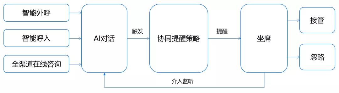 智能协同,作为AI对话的“好帮手”,可有效弥补AI对话结果不可控的缺点。智能协同包含外呼协同、呼入协同、会话协同(静默会话)等,是指在进行智能外呼、智能呼入、智能客服等AI对话时,触发协同提醒规则后(遇到AI无法处理的问题或用户提出新需求等情况)实时提醒人工监听对话,查看客户与AI的对话内容,及时进行干预,或在用户零等待、零感知的情况下通过人工无感方式介入,实现1+1>2服务。