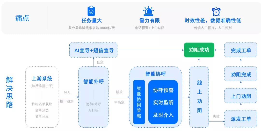 在公安反诈场景中,当AI向民众宣讲反诈知识时,触发了协同提醒规则,如发现通话内容涉及诈骗、打款、求助等信息,系统将会自动提醒处理员,介入监听通话内容,必要时接管通话,及时降低诈骗发生概率,挽救群众损失。