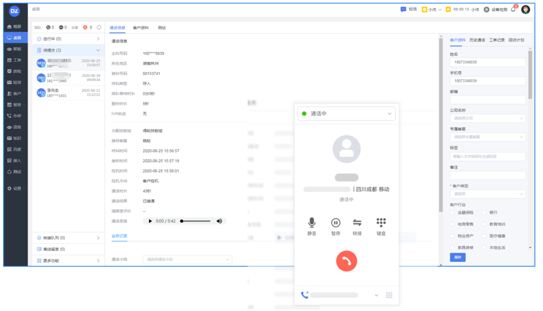 客户来电时可轻松掌握客户信息服务过程可标注、可转接、可派单真正实现坐席高效通话