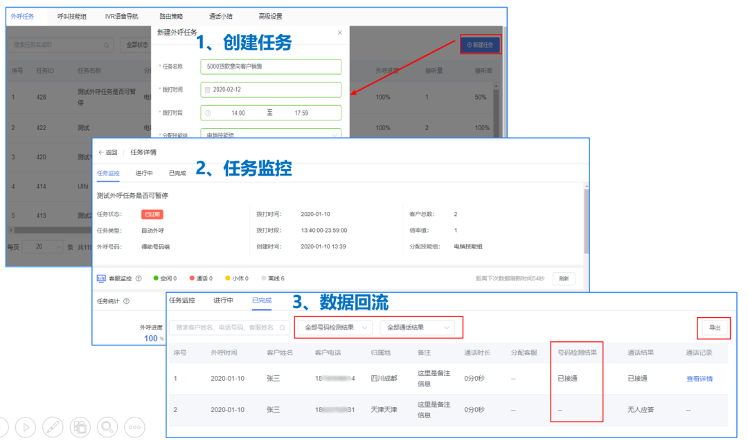 批量外呼,通过外呼任务有效控制坐席的工作,系统自动外呼,自动去除无效号码,解放人力,整体拨打效率提升100%以上