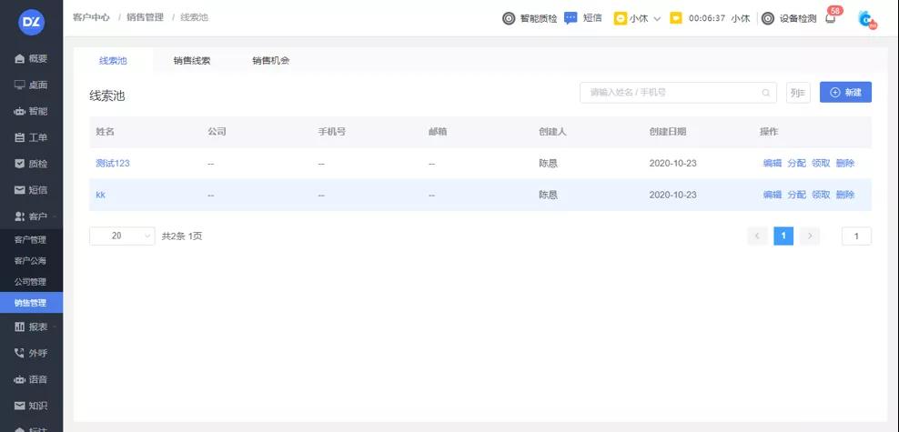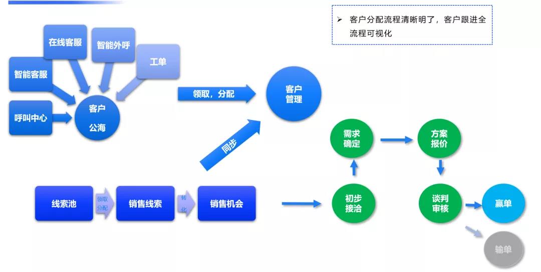 公海客户,销售线索经过领取、分配等筛选操作进入客户管理系统进行精细化客户管理,客户导出等操作
