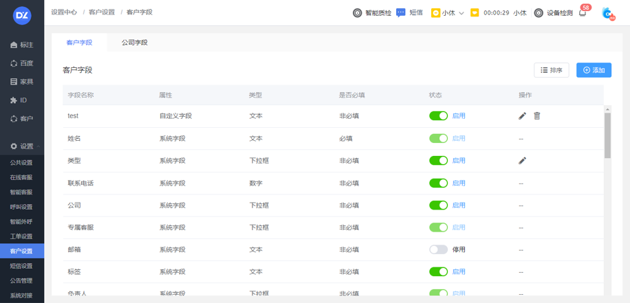 可自定义客户、公司的字段、字段类型、字段属性;