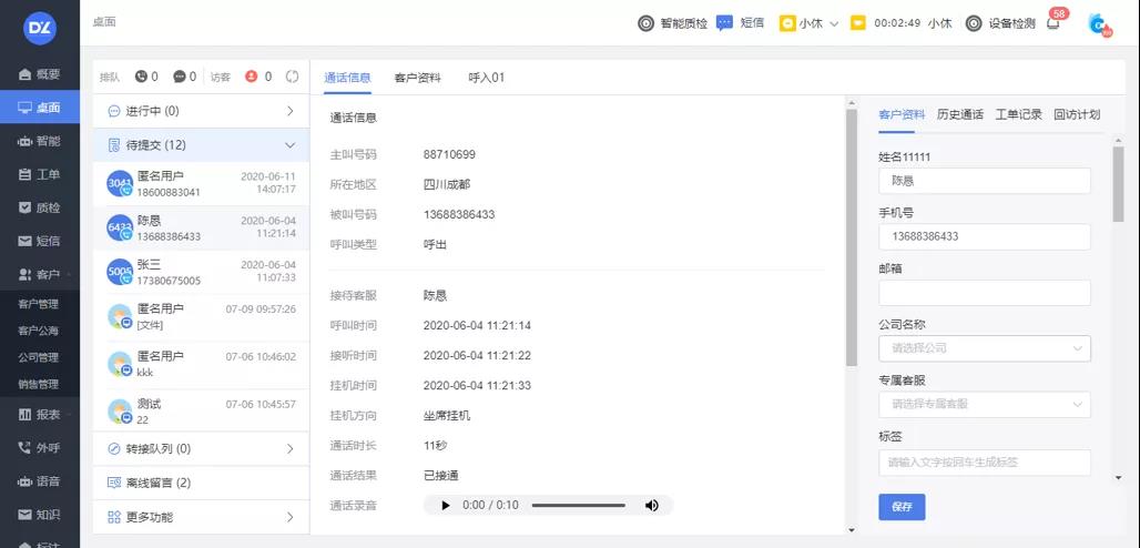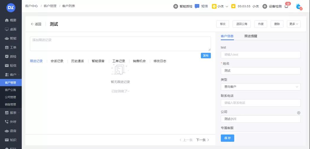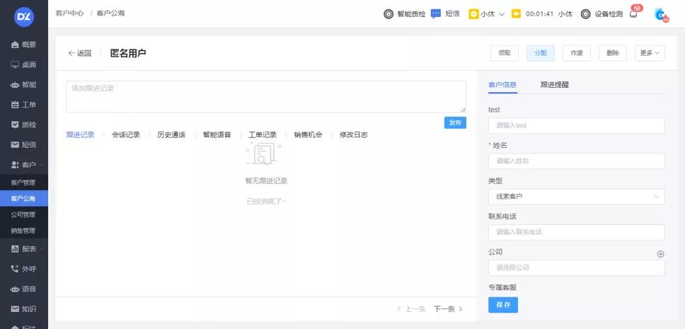 支持客户跟进记录添加及查询\支持会话记录、电话记录、工单记录全览及关联详情查询