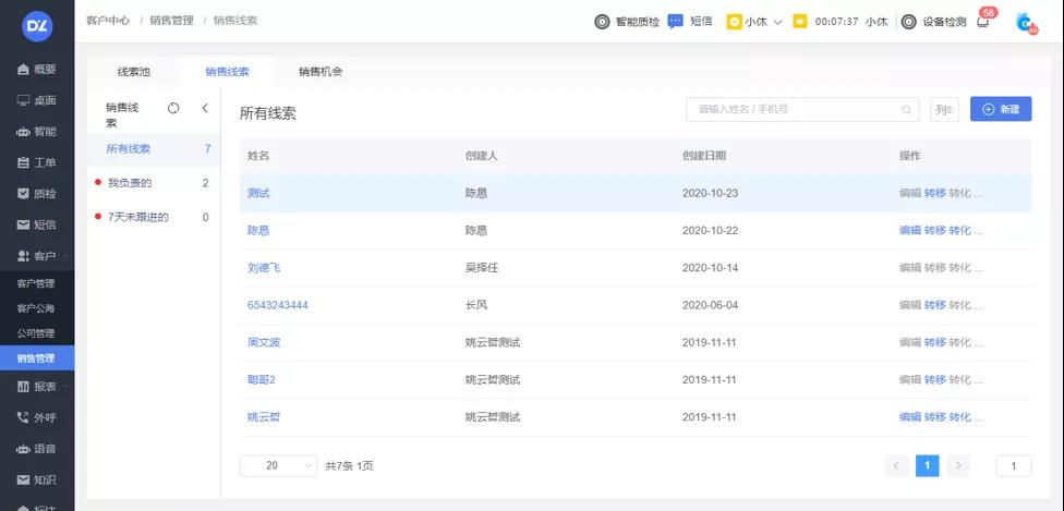 销售线索管理,支持手机号,名字搜索,新增线索,自定义表单,可对线索进行编辑,转移,转化,作废以及删除