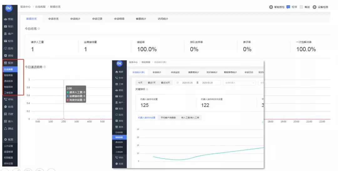在线客服、智能客服、通话报表、智能语音、工单报表都可清晰查看