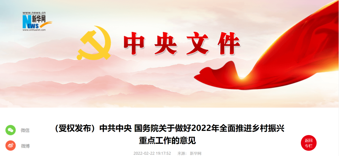 2月22日,《中共中央国务院关于做好2022年全面推进乡村振兴重点工作的意见》(即2022年中央一号文件)发布。中央一号文件素来有着关注“三农”工作的传统,这是连续第19年聚焦三农。在疫情蔓延、世界经济复苏脆弱、气候变化挑战等背景下,党中央强调稳住农业基本盘、做好“三农”工作,全面推进乡村振兴,对国家而言是非常重要的战略需要。