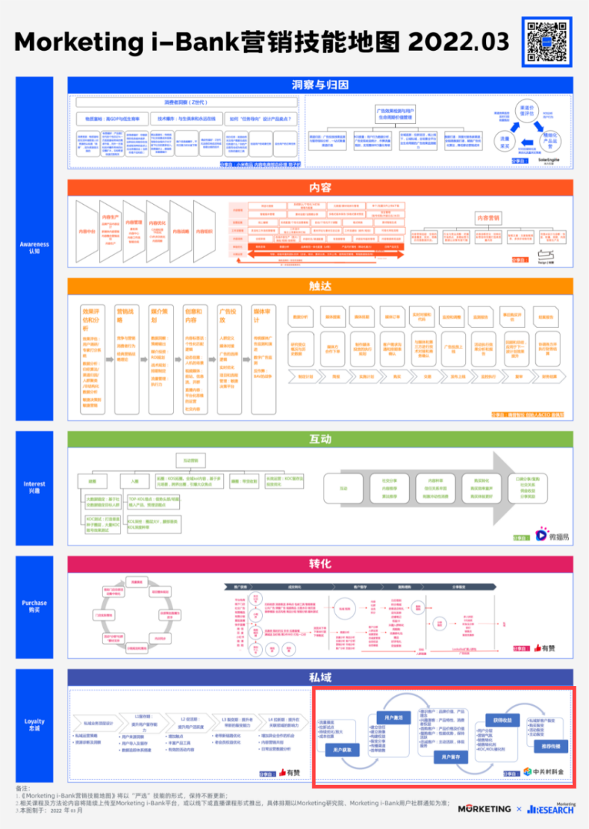 据了解,“技能地图”是「Morketing研究院」面向市场人推出的年度技能严选目录,是营销人的2022年度技能提升指南。“技能地图”整体逻辑延续新版《2022中国MarTech行业生态图》(以下简称为“生态图”)链路,根据“生态图”所对应的“AIPL”营销模型,技能地图版块划分为洞察与归因、内容、触达、互动、转化和私域六大版块。并基于不同营销版块,梳理出该版块内的前沿营销技能或方法论内容。