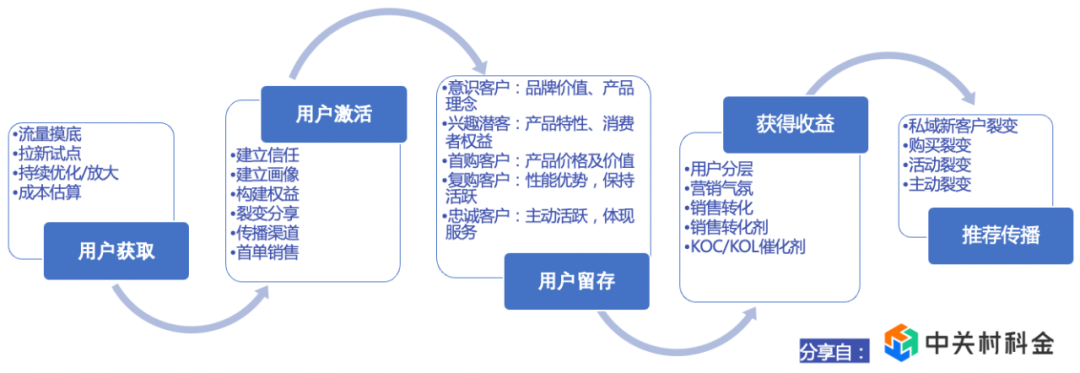 目前,众闯信息科技在私域领域已总结出成体系的方法论。从用户获取-用户激活-用户留存-获得收益-推荐传播共经历了五个阶段,将新用户积累到自己的私域池中,每一个阶段都已沉淀出成熟的打法及流程,并在最终的推荐传播阶段达到私域客户不断裂变的目的以扩大私域池。
