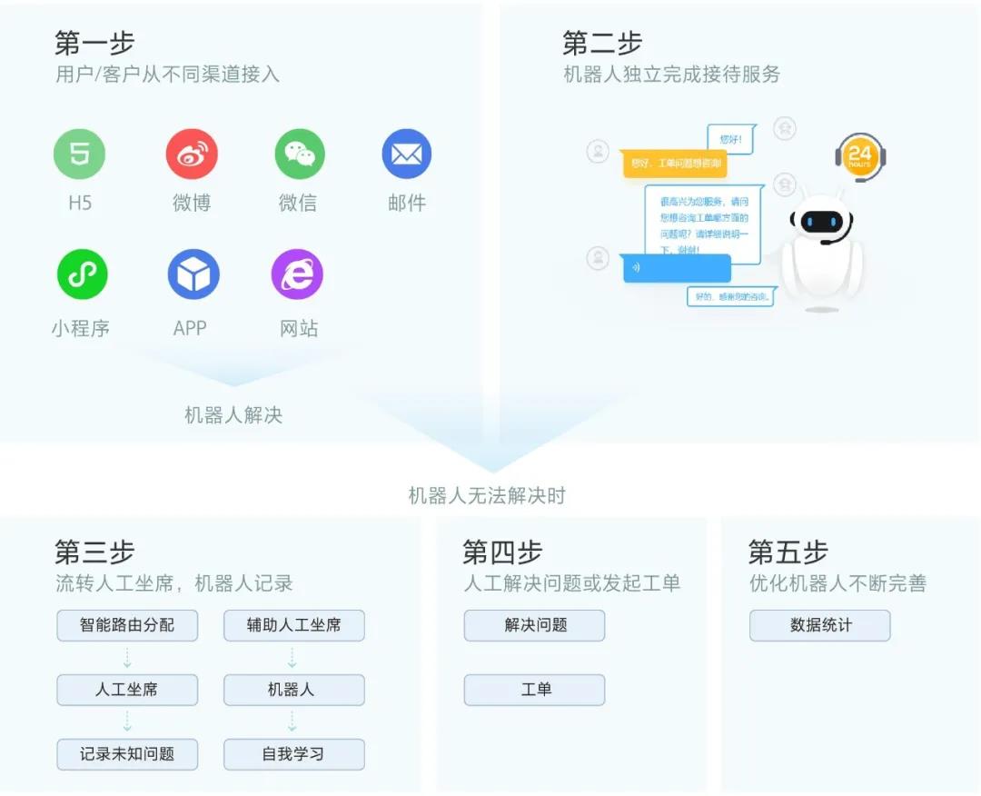 以云客服为例,通过深挖各行业的客户服务痛点,打造以云呼叫中心、客服机器人、在线客服、智能工单、CRM管理为核心的云客服平台。通过全面的底层系统建设完善客户服务流程,打通关键节点的数据连接,形成完整的服务体系,帮助解决目前大多数企业面临的“渠道来源多、管理难度大、服务效率低”等难题,真正为提高服务效率、促进销售转化等创造价值。