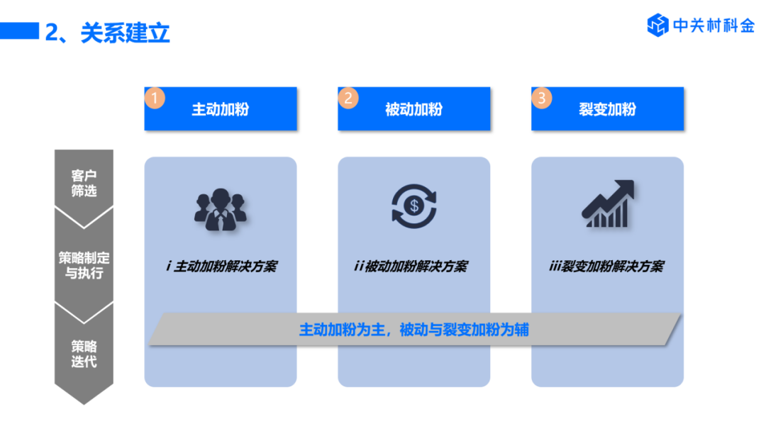 客户关系建立的业务目标是将全部客户(潜在+存量)添加至机构的私域渠道,通过主动加粉、被动加粉、裂变加粉这三种方式实现私域加粉。