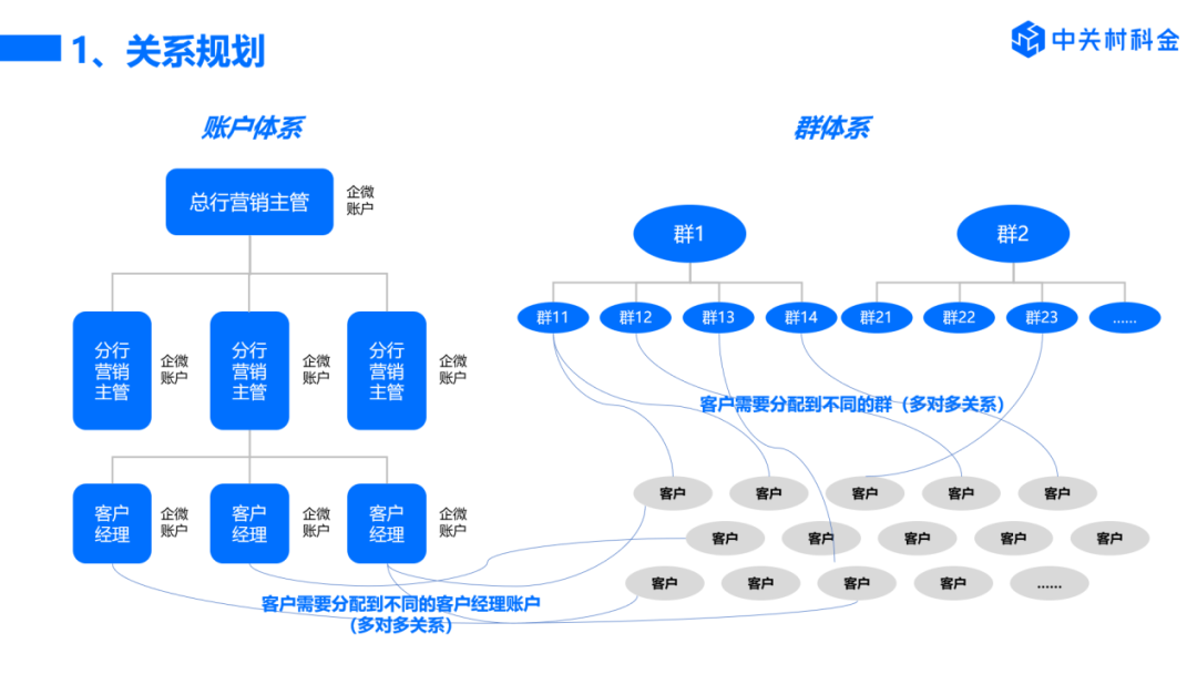 客户关系规划的业务目标在于规划内部营销组织(客户经理)与全部客户(潜在+存量)的对应关系。具体策略包括规划企微账户体系、企微群体系、客户与账户、客户与群的多对多对应关系。根据规划的目标对账户、群、客户归属账户和群的关系现状进行梳理及分析,找出现状与规划目标之间的差距后再进行关系调整。构建涵盖整体组织的客户关系规划方案为后续关系维护奠定基础。