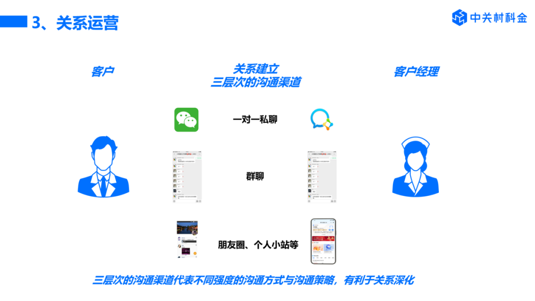 客户关系运营的目标是通过体系化、标准化、个性化运营实现客户关系的长期发展,取得客户的良好信任并最终实现业务转化。众闯信息科技智能化私域营销解决方案采用旅程营销理念,根据不同客户需求进行客户细分,为不同类型的客群定制差异化的营销运营SOP来实现高质量的转化。其中,SOP涵盖一对一私聊、群聊、朋友圈和个人小站这三种不同层次、不同强度的沟通方式与沟通策略,根据客户关系阶段采取不同的触达策略,不断将客户旅程向前推进,最终实现关系深化以及业务转化。