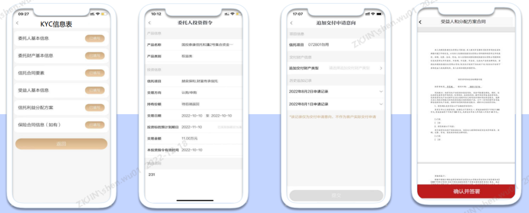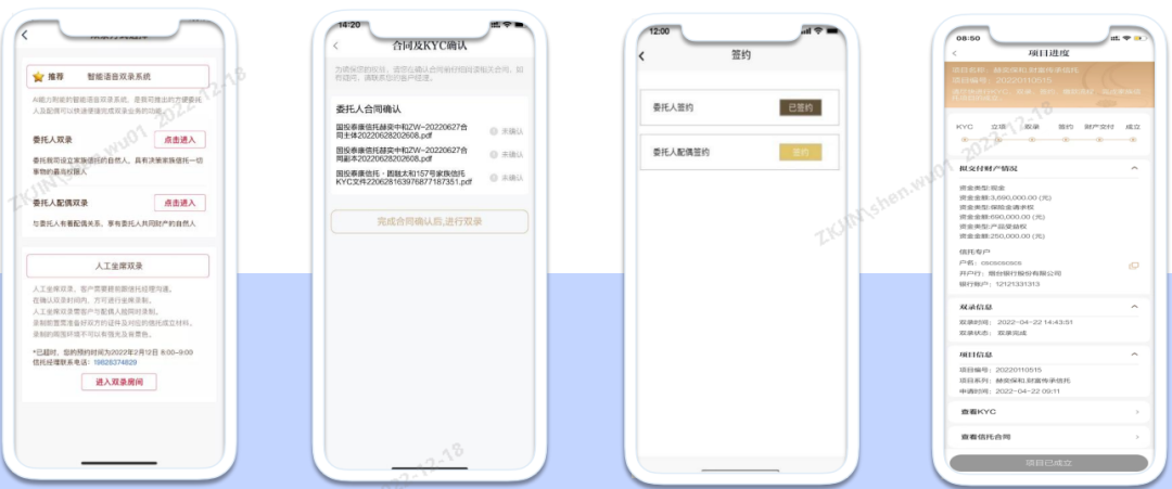 在众闯信息科技多项自研科技加持下,赫奕家信APP让家族信托项目可以线上化办理,打破时空局限,让业务流程节点清晰便捷,操作方便:KYC,项目立项,双录,签约,缴款,账单交付,项目成立,持仓管理,受益人和方案变更,委托追加。