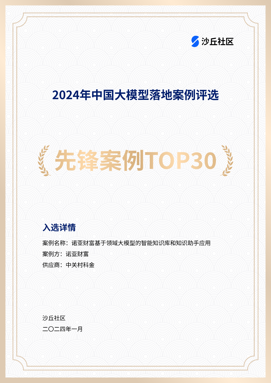 近日,沙丘社区重磅发布2024中国大模型先锋案例TOP30。众闯信息科技携手诺亚财富打造的《基于领域大模型的智能知识库和知识助手应用》,凭借技术创新优势、商业落地速度和产业应用价值,荣登榜单。