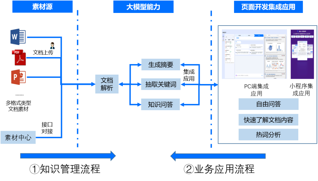 在知识管理流程方面:通过人工上传或接口对接素材中心,获取word、PDF、PPT、音视频等文档素材,通过大模型能力,对多模态的文档实现智能解析,并生成文档摘要、关键词以及知识问答内容。