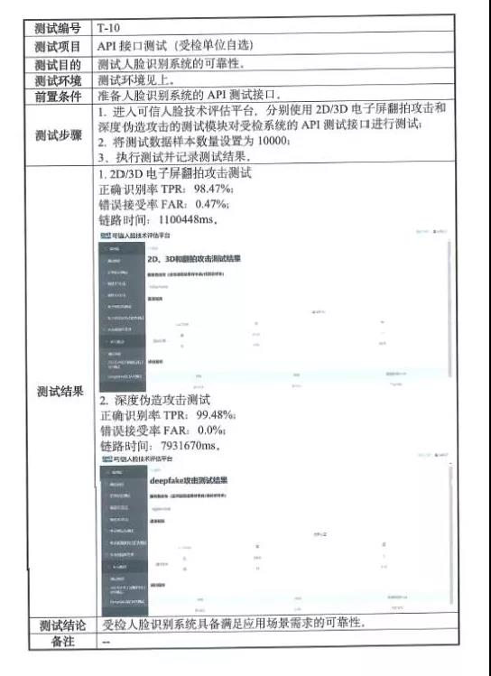 据中国信通院检测报告内容显示,本次防伪测试项包括电子图像攻击、真人视频攻击、合成视频攻击、2D照片攻击、挖孔照片攻击、3D面具攻击、注入攻击等攻击方式,完全覆盖了公安部2020年11月公布的7项人脸攻击风险。