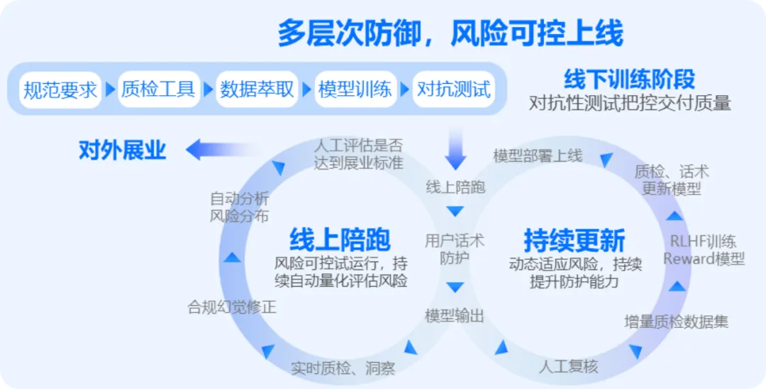 具体而言,“双飞轮”风险防控机制包含“线上陪跑”和“持续更新”两大策略,即在模型上线前“陪跑”检测其可靠性,确定风险可控后,方能上线运行。上线后,继续辅以“更新防御策略”,从而更全面地规避幻觉和合规风险。