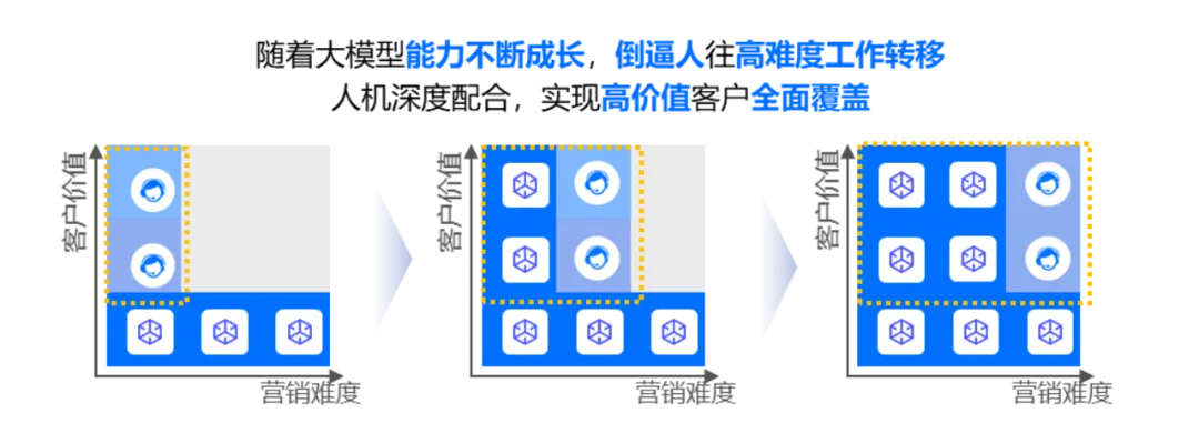 随着电销大模型能力持续向绩优坐席趋近,逐渐掌握极强的理解能力和生动的营销技巧,由此可以覆盖更广阔的客群,促使人工可以更专注于高价值客户的困难攻坚任务,最终实现“价值客群+营销难度”的全覆盖。