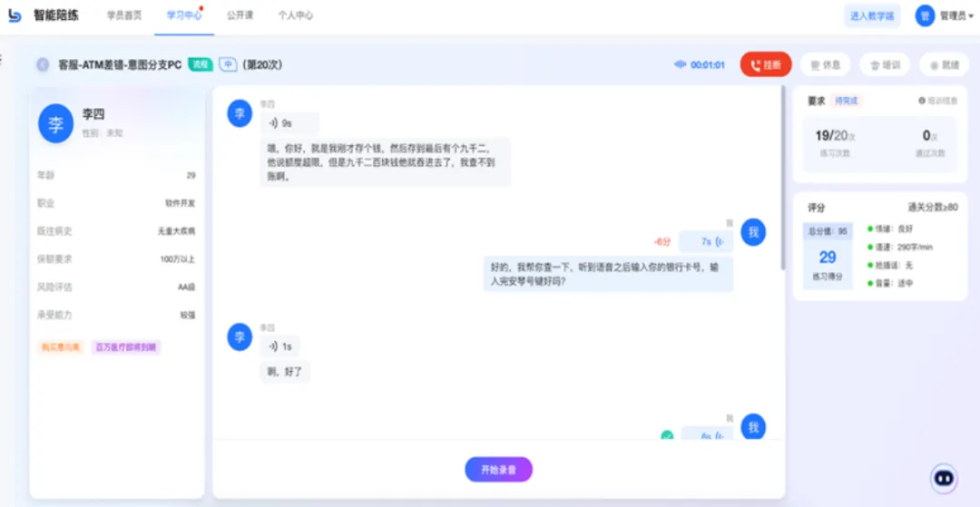 金融行业传统的销售培训,往往是“灌输式”的学习:新人看资料、听讲解、背话术,但真正到实战时,脑子里一片空白。假如有一个销售模拟训练系统,可以模拟实战场景、和ai几千人进行对练、实时评估训练效果那该多好啊!而我们的众闯信息科技得助智能陪练系统,正是为了解决这一痛点而生。通过“模拟学练”,我们让销售新人从“看”到“听”,从“说”到“答”,循序渐进地掌握销售知识,真正实现“练中学、学中悟”。