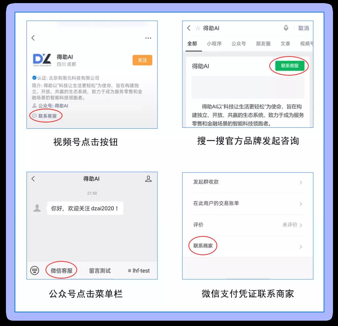 以视频号为例,用户只需进入企业的视频号主页,便能一键联系客服发起对话,为用户主动触达企业建立联系提供极大便利。企业则可通过得助全渠道工作台,实时接受用户咨询,为用户提供及时高效的个性化服务。