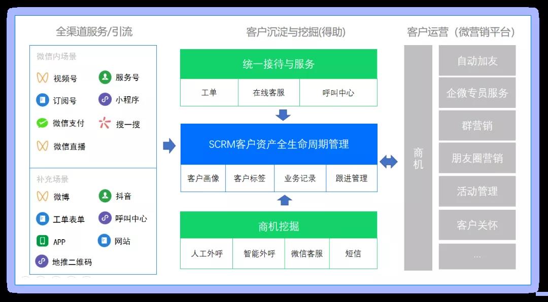 基于此,众闯信息科技旗下得助·智能交互全面引入微信客服,打造得助·微信客服全新功能,在微信渠道嵌入得助智能服务入口,拓展营销服务广度和深度,帮助企业快速建立全渠道营销服务体系,全面触达用户,实现公域+私域的全域营销覆盖。