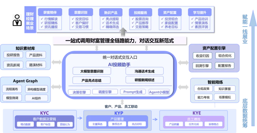 资产配置引擎先根据客户的基础KYC和本笔投资意图,综合判断客户情况,提供产品推荐。之后投顾助手自动从产品库中查询产品的要素、各类信息、净值表现等,提炼核心卖点、推荐话术等,为客户生成一个综合的产品推荐卡片。