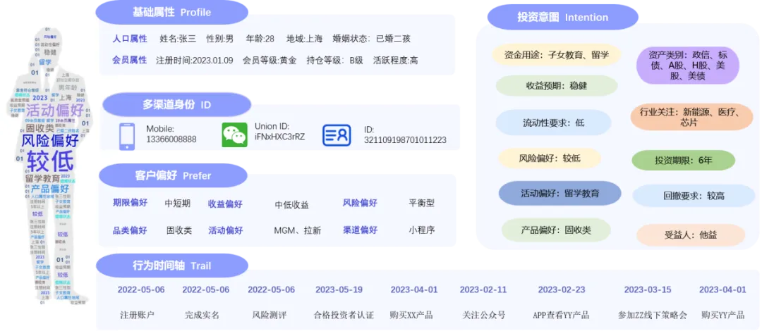 客户理解是买方投顾以客户为中心的核心,金融机构借助CDP客户信息平台系统,可以将机构多年积累的客户信息、交易数据、行为数据等综合应用,根据以下几个维度建立客户360全景画像。