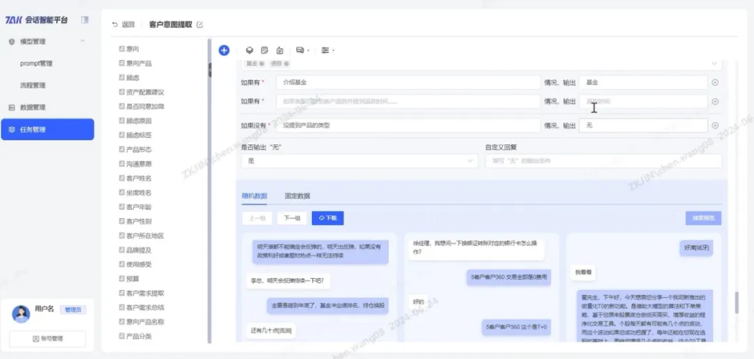 如下图实际效果,通过应用【新一代会话洞察平台】,投顾助手实现了从客户的企微会话中,提取客户的投资意图,形成投资参数的流程。