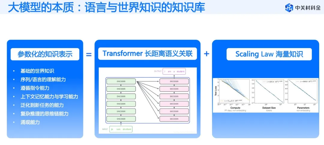 另一方面是得益于Scaling Law,即规模法则。通过大量的算力,把海量的知识一点一点放到大模型参数的网络结构里。现在的大规模语言模型比原来小模型智能程度更高、记性更好、理解能力更强,让我们看到了强人工智能的可能性。