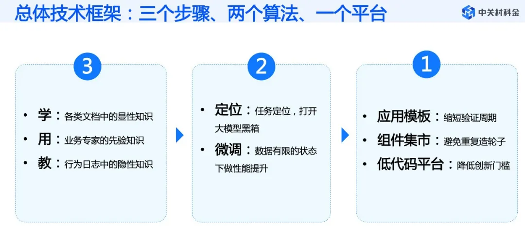 基于过往多个大模型项目的实施经验,众闯信息科技形成了一套总体技术框架,概括为三个步骤、两个算法、一个平台。