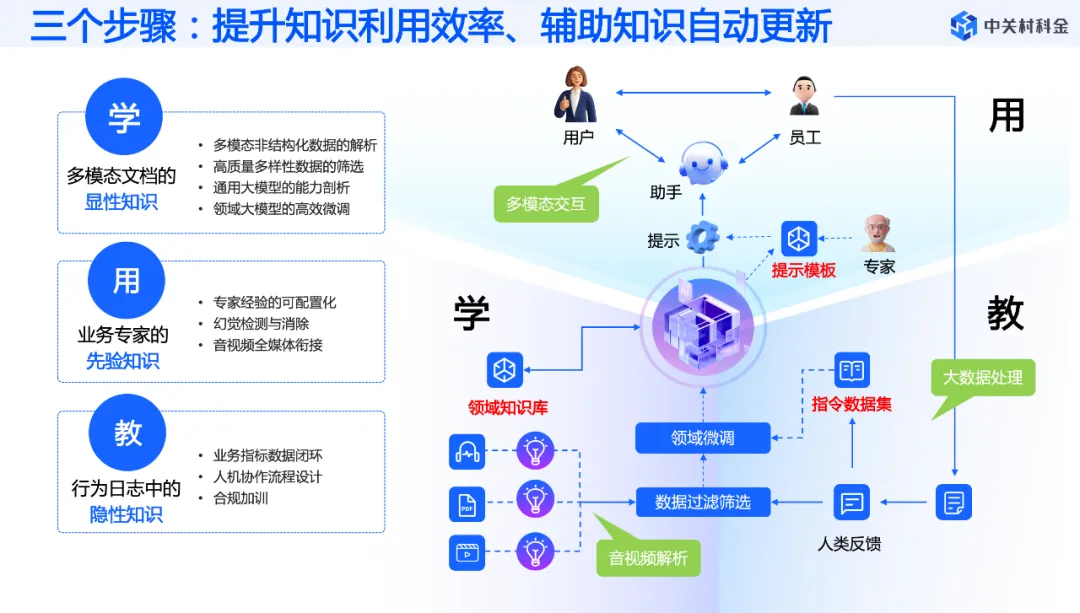 详细介绍下三个步骤。“学”主要是学习多模态文档中的显性知识,“用”是指业务专家的先验知识。在不同应用场景,业务专家反馈大模型在当前场景底下哪些话要说,哪些话不能说,解决某个问题应该按照什么步骤去解决,步骤从哪来。“教”是指从行为日志或业务结果中整理加工出数据集,指令数据集对企业来讲是最有价值的一部分。