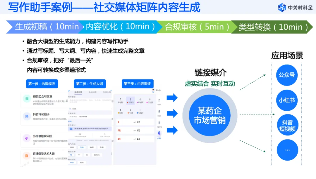 根据题目从海量的知识库里搜索素材,通过多轮交互告诉大模型需要用什么样的模板或者定制化生成一篇什么结构、语言风格的文章,及每个段落的要点。在文章发出前,需要大模型进行格式和特定领域规则的审核。这样大模型就可以短平快生成面向各个不同社交媒体,生成不同风格的文章。