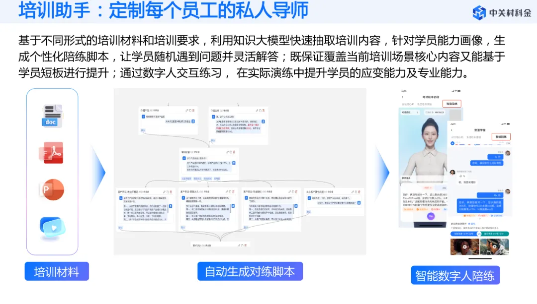 基于不同形式的培训材料和培训要求,利用知识大模型快速抽取培训内容,针对学员能力画像,生成个性化陪练脚本,让学员随机遇到问题并灵活解答;既保证覆盖当前培训场景核心内容又能基于学员短板进行提升;通过数字人交互练习,在实际演练中提升学员的应变能力及专业能力。
