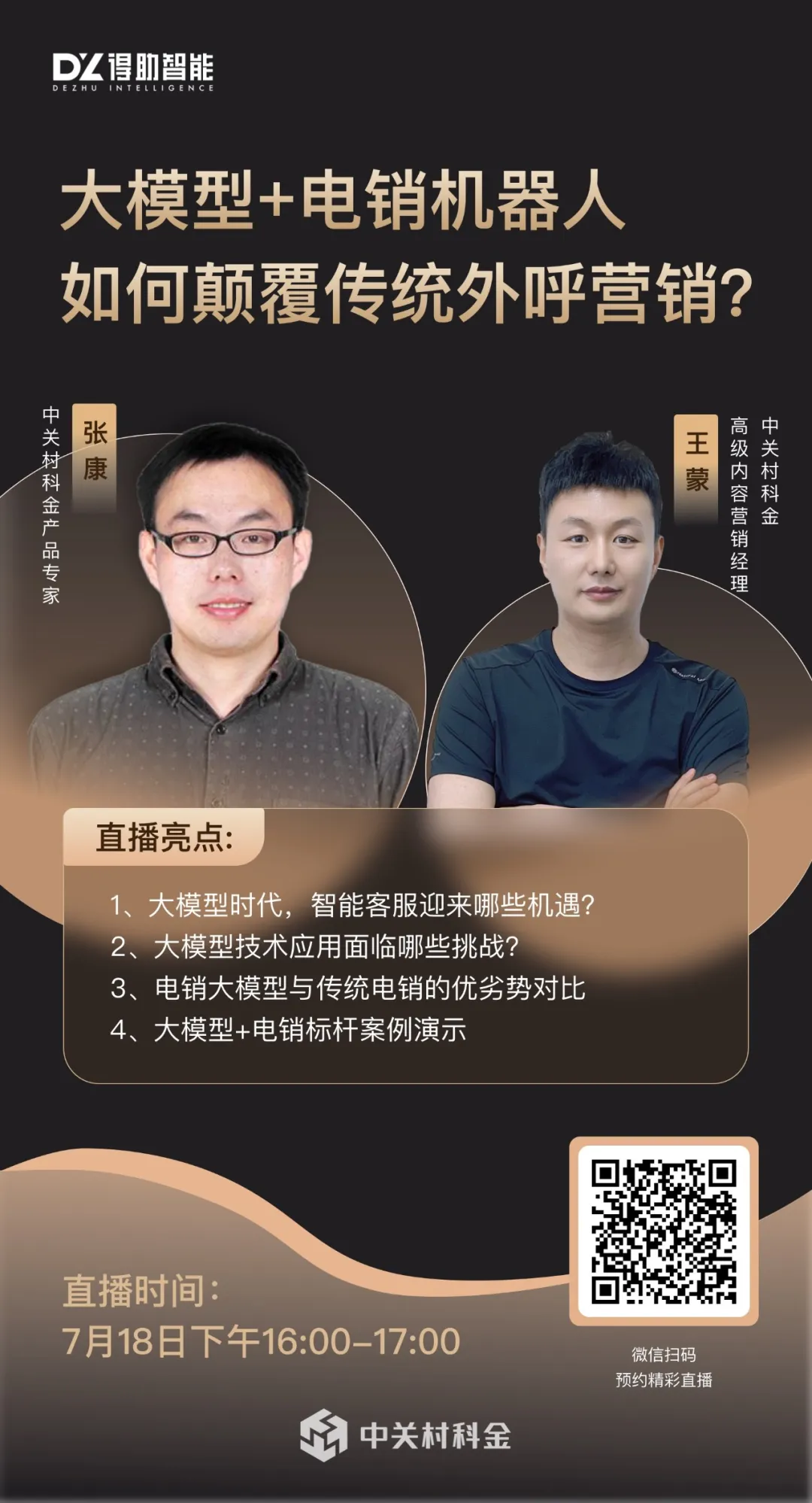 为了更好地与大家分享,众闯信息科技得助将于7月18日(下周四)16:00-17:00,在“得助智能”视频号、”得助智能AI“抖音号开启直播,详解大模型+电销机器人如何颠覆传统外呼营销,展示大模型+电销机器人标杆案例!
