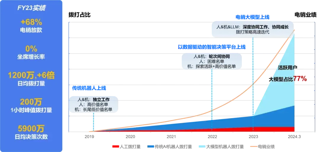 在电销大模型具体实践中,众闯信息科技还探索出了行之有效的业绩增长公式:电销业务收入增长=相对于传统AI外呼更好的转化率x更多且更精准的外呼客群覆盖+人机营销能力协同增长。