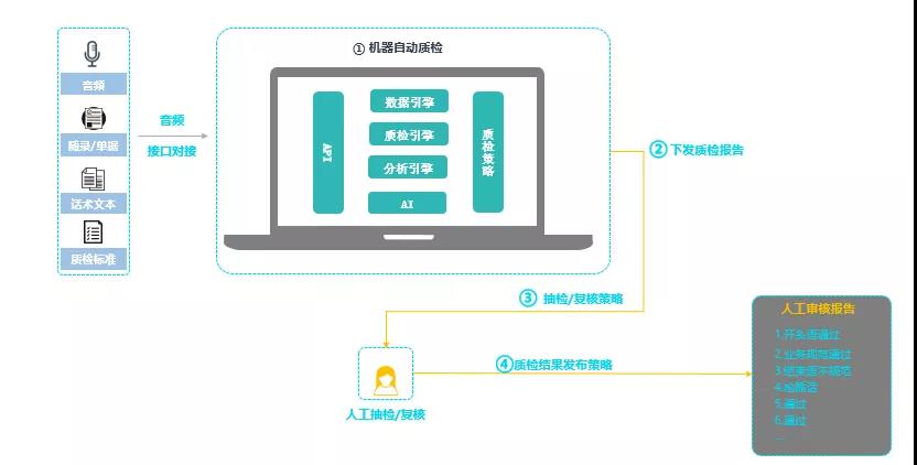 第一个主要流程是机器自动质检流程,机器自动质检让企业摆脱了传统人工质检的弊端,基于AI、大数据等先进技术,实现100%全量质检。