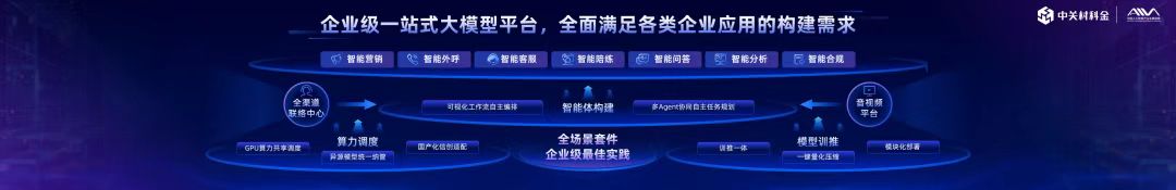 基于众闯信息科技的“三级引擎战略”,向大家介绍我们的产品全景图。通过全媒体联络中心和音视频平台这两大数字化平台,把企业与客户连接的各种渠道、各种媒介进行很好的整合,以及企业与内容员工的连接。在此之上,得助大模型平台可以提供从算力调度,模型训推到智能体构建。再结合企业的应用场景,在智能营销、智能客服、智能运营、知识管理等领域提供非常丰富的产品解决方案。同时结合各行各业的应用场景推出了一系列场景解决方案。这是众闯信息科技过去一段时间里的心得和方法。