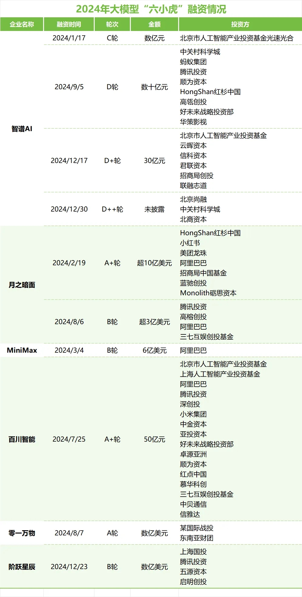 大模型融资市场同样起伏明显。2024年年中,大模型“六小虎”纷纷“摸高”200亿估值门槛,但随后市场一度沉寂,直到2024年最后一个月,经历了一轮洗牌后,市场才又再次回暖,国内外市场传出不少融资动态:xAI拿下60亿美元融资,Perplexity AI完成5亿美元融资,智谱AI获得新一轮30亿元融资,阶跃星辰也拿下了数亿美元融资……